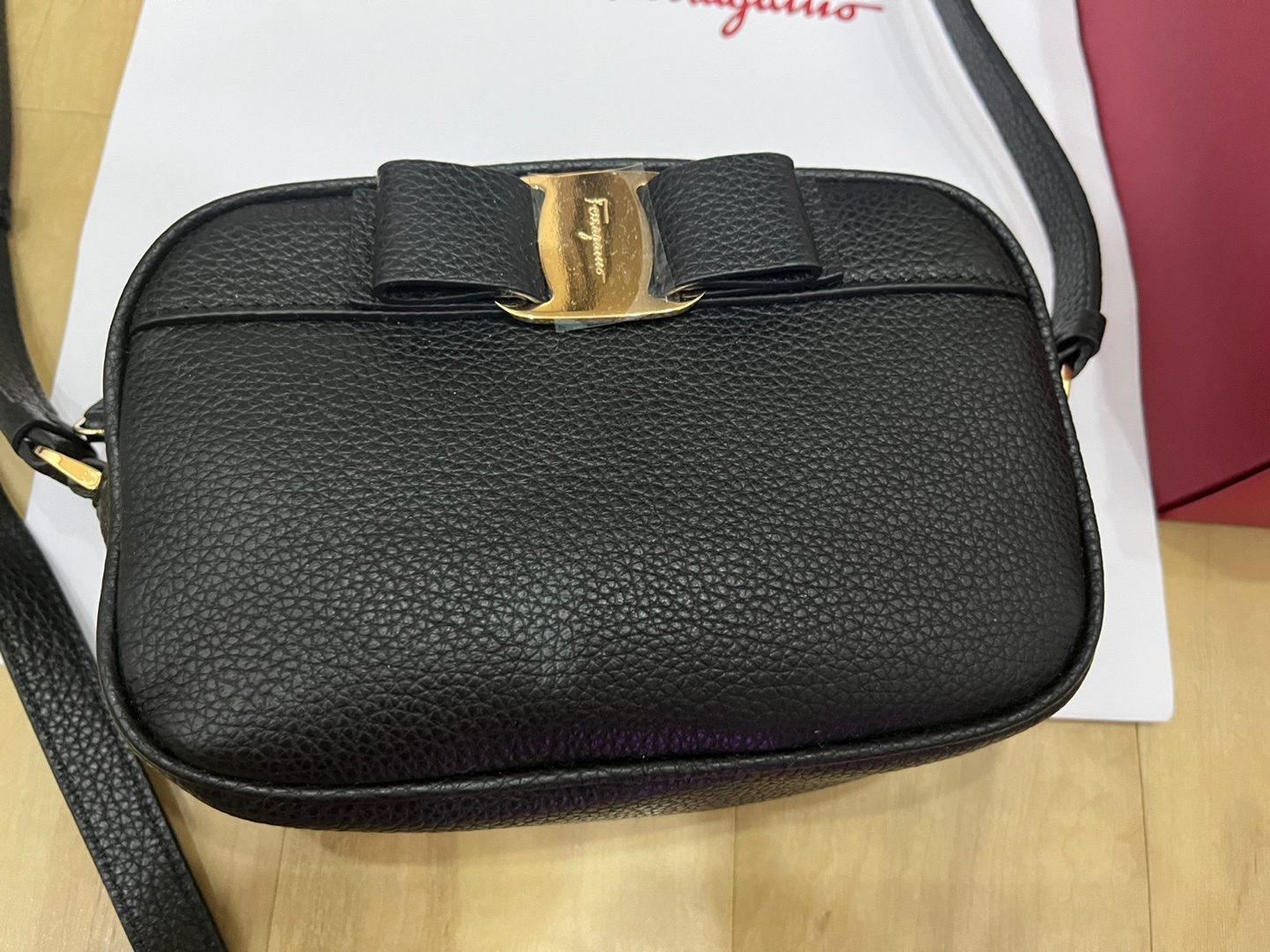 페라가모 블랙 바라리본 레더 카메라백